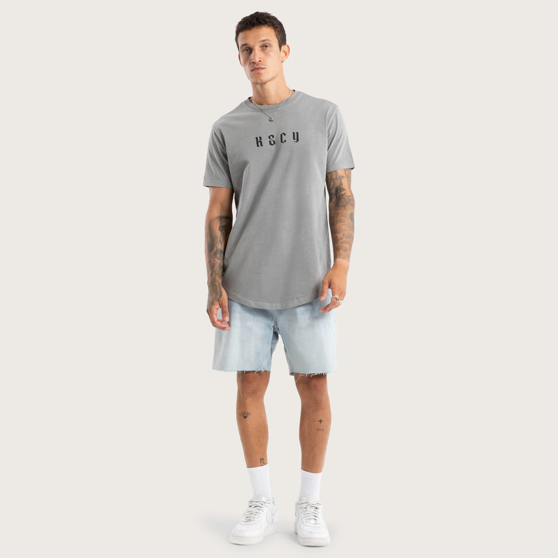 The Surplus Dual Curved Tee in Pigment Frost Grey features a slim fit in the body and arms, finished with a long length and curved hem.
